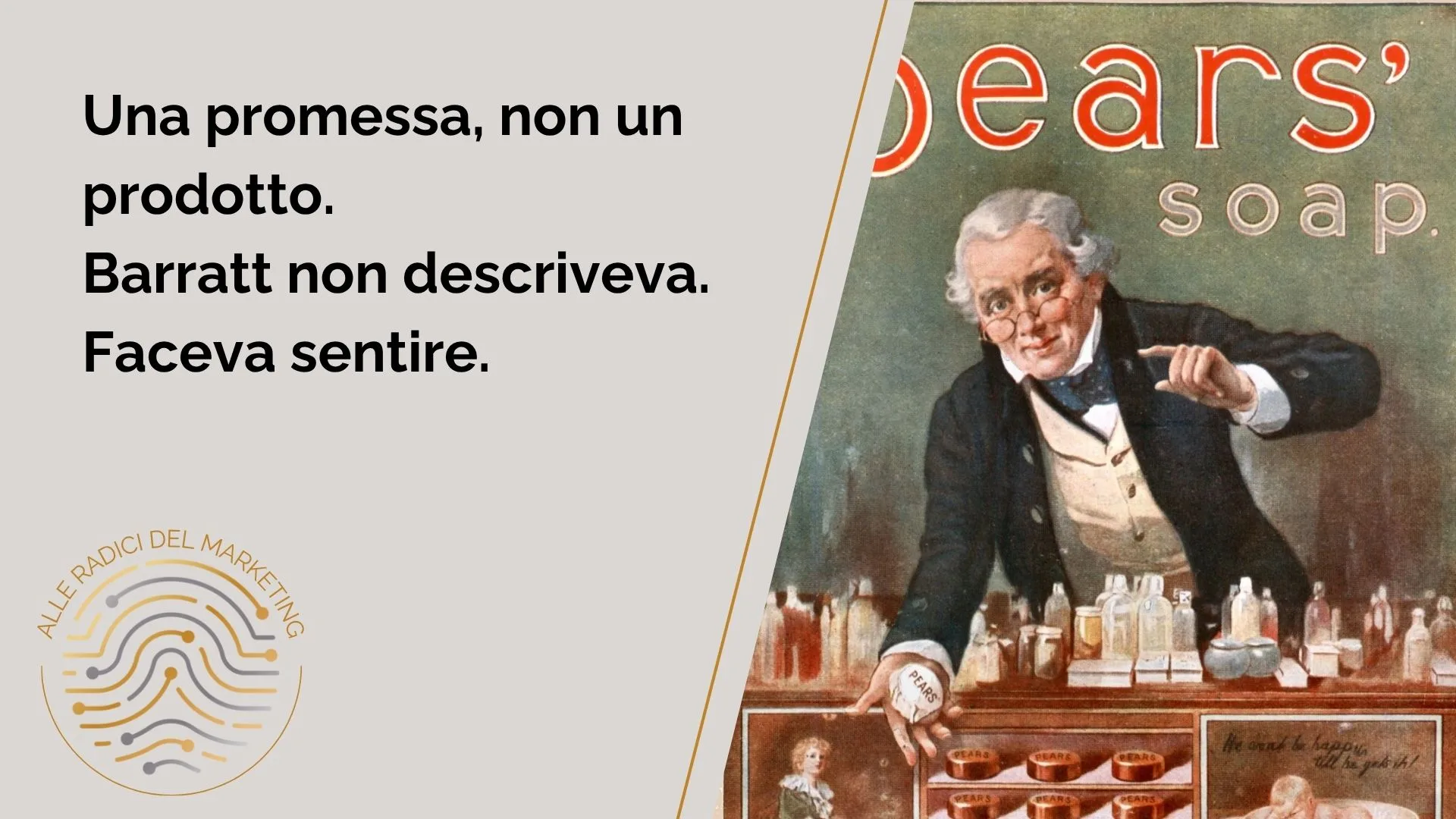 Thomas James Barratt è considerato da molti il padre della pubblicità moderna. Era il responsabile marketing della A. & F. Pears Soap Company, un’azienda londinese che produceva sapone raffinato, trasparente, profumato. Un prodotto semplice, ma in un mercato saturo e affollato. E fu proprio per questo che Barratt capì che non bastava avere un buon prodotto. Bisognava costruirgli attorno un mondo.