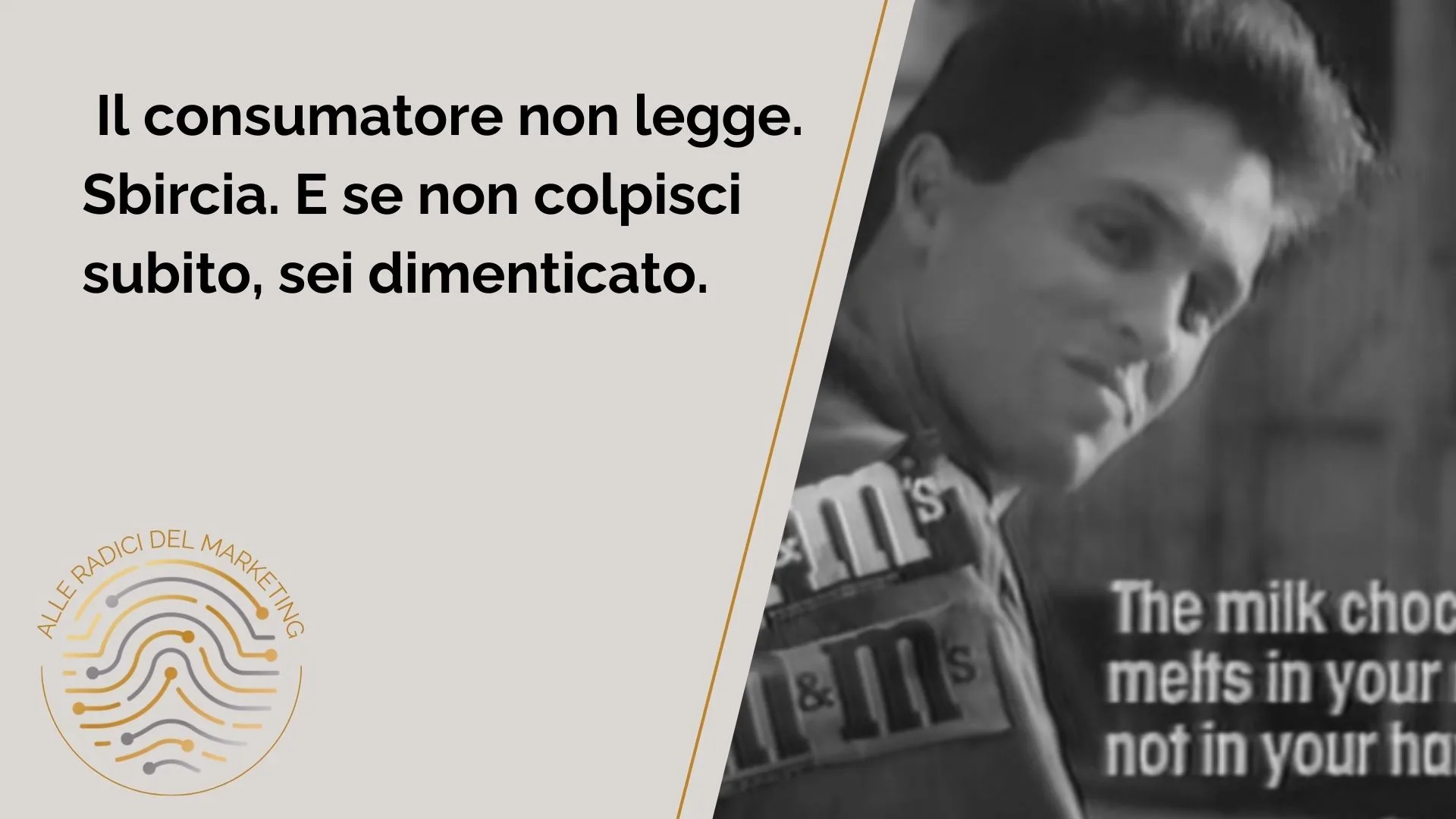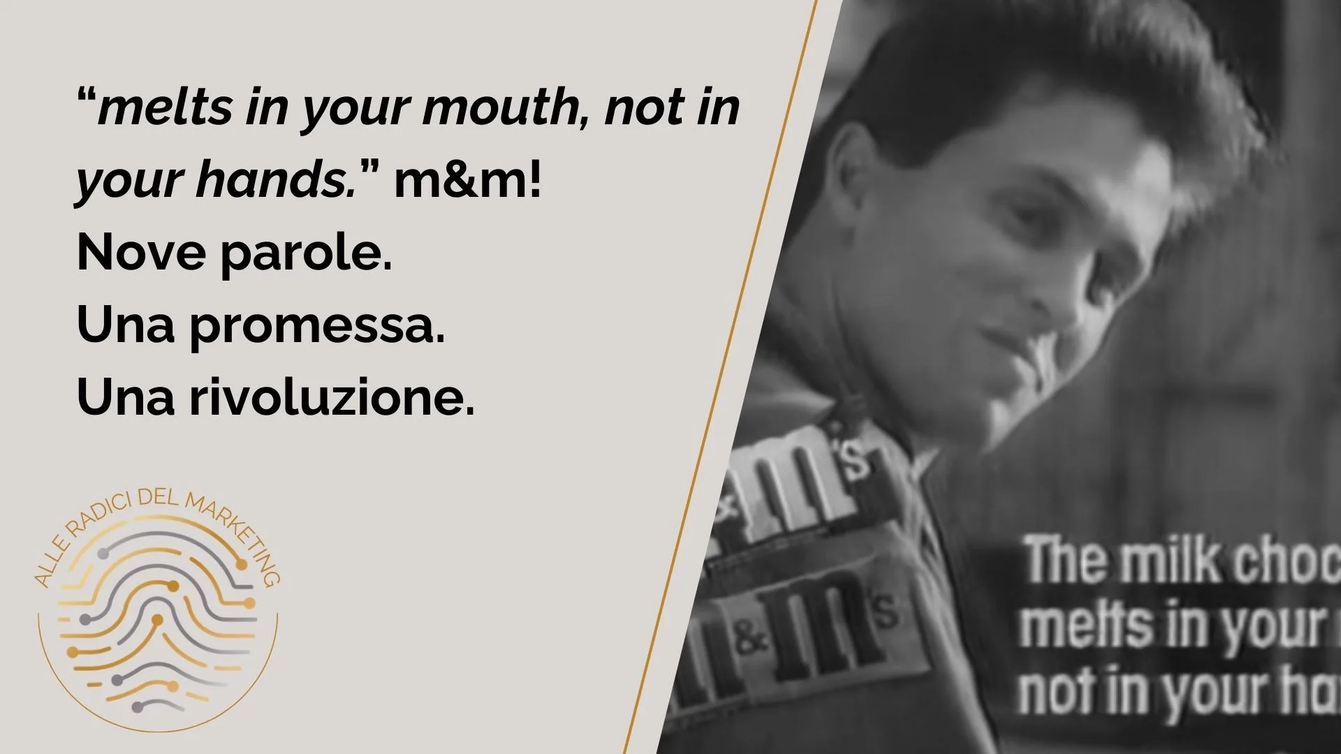 Nove parole che hanno cambiato il destino del prodotto. La promessa era reale (il confetto di zucchero proteggeva il cioccolato), ma Reeves la rese memorabile, concreta, indiscutibile. E la ripeté ovunque: in stampa, in radio, in televisione. Nessun gioco di parole, nessuna ironia, nessuna variazione sul tema. Solo la verità ripetuta come un mantra pubblicitario.
